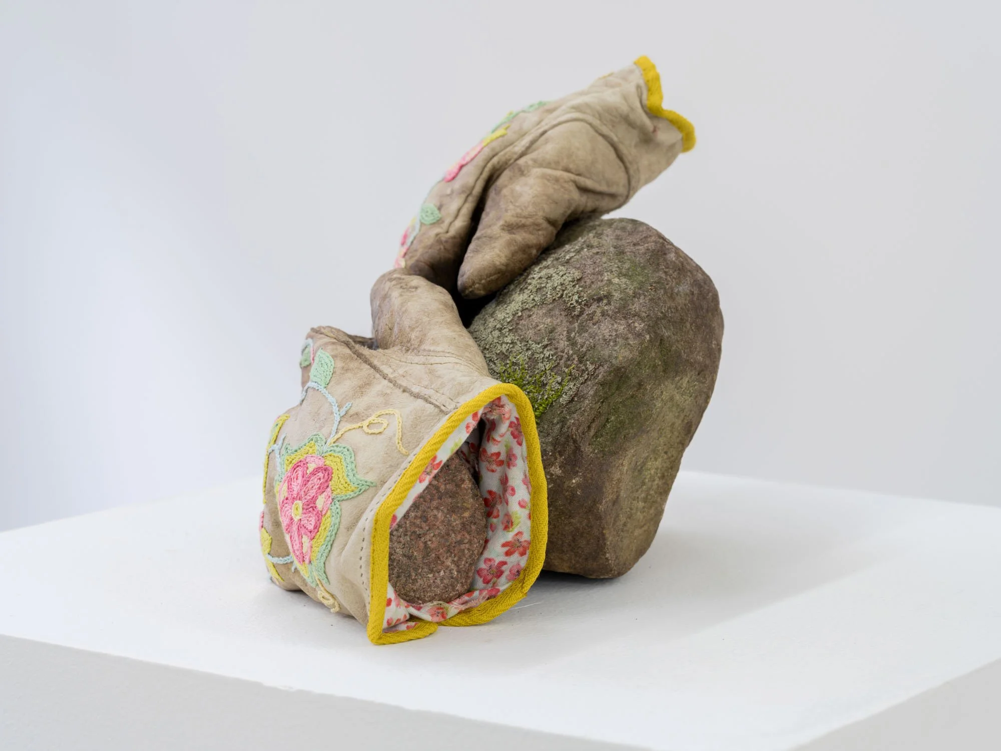 Haley Bassett, The Rock Pickers, 2025. Worn work gloves, embroidery floss, twill tape, cotton fabric, thread, imitation sinew, field stones. 7 x 13 x 6 inches. Photography courtesy of Galerie Nicolas Robert.