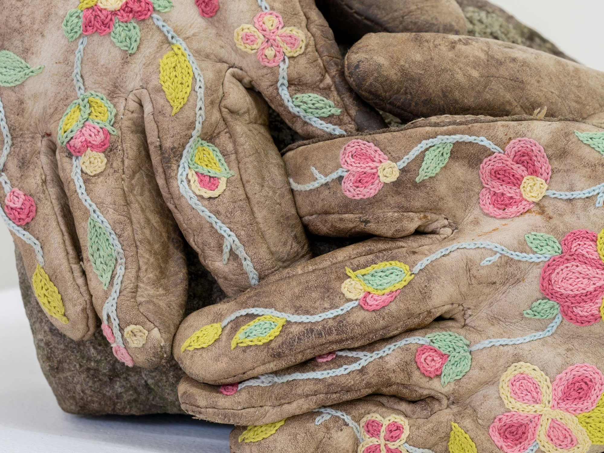Haley Bassett, The Rock Pickers, 2025 (detail). Worn work gloves, embroidery floss, twill tape, cotton fabric, thread, imitation sinew, field stones. 7 x 13 x 6 inches. Photography courtesy of Galerie Nicolas Robert.