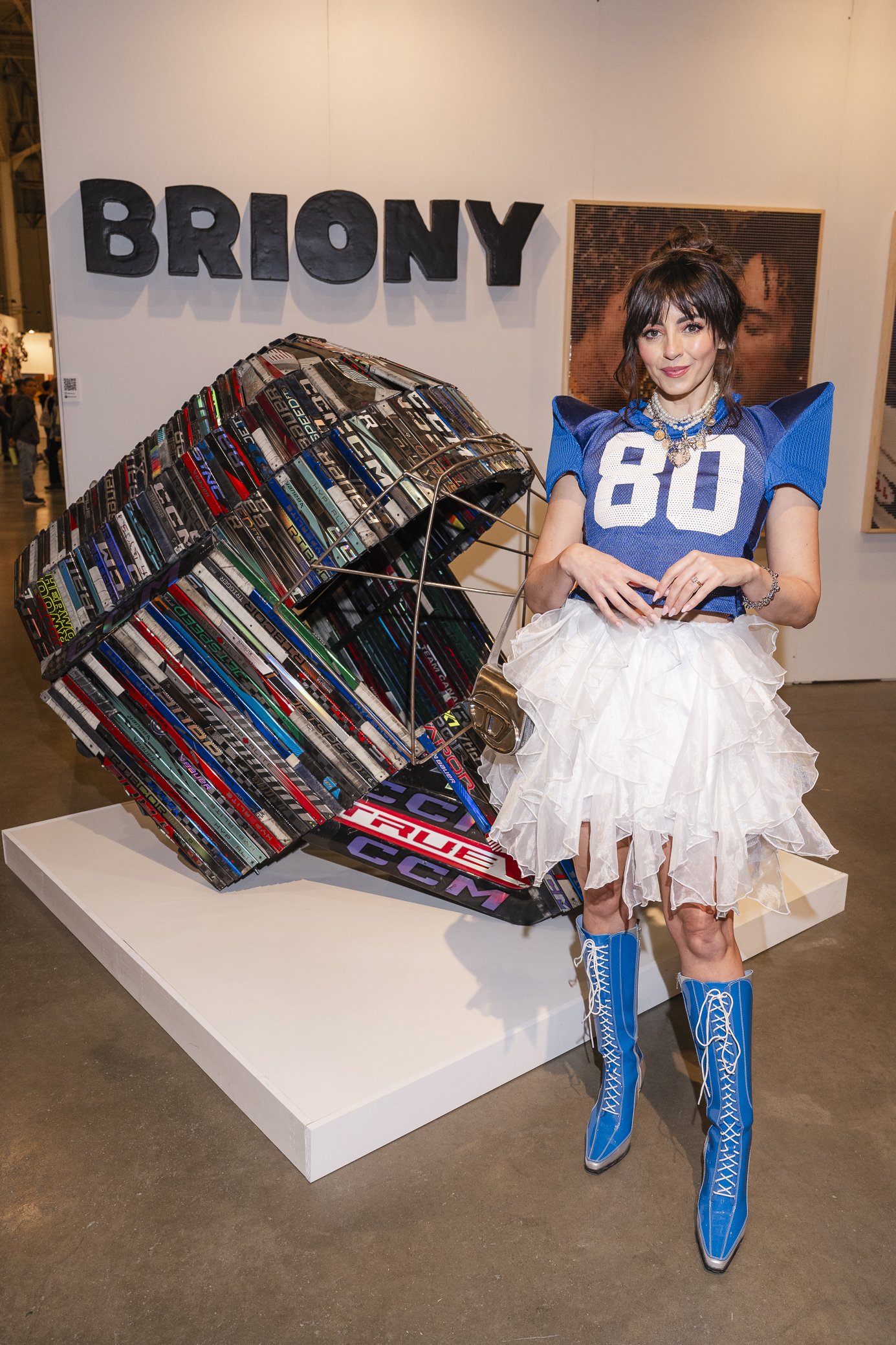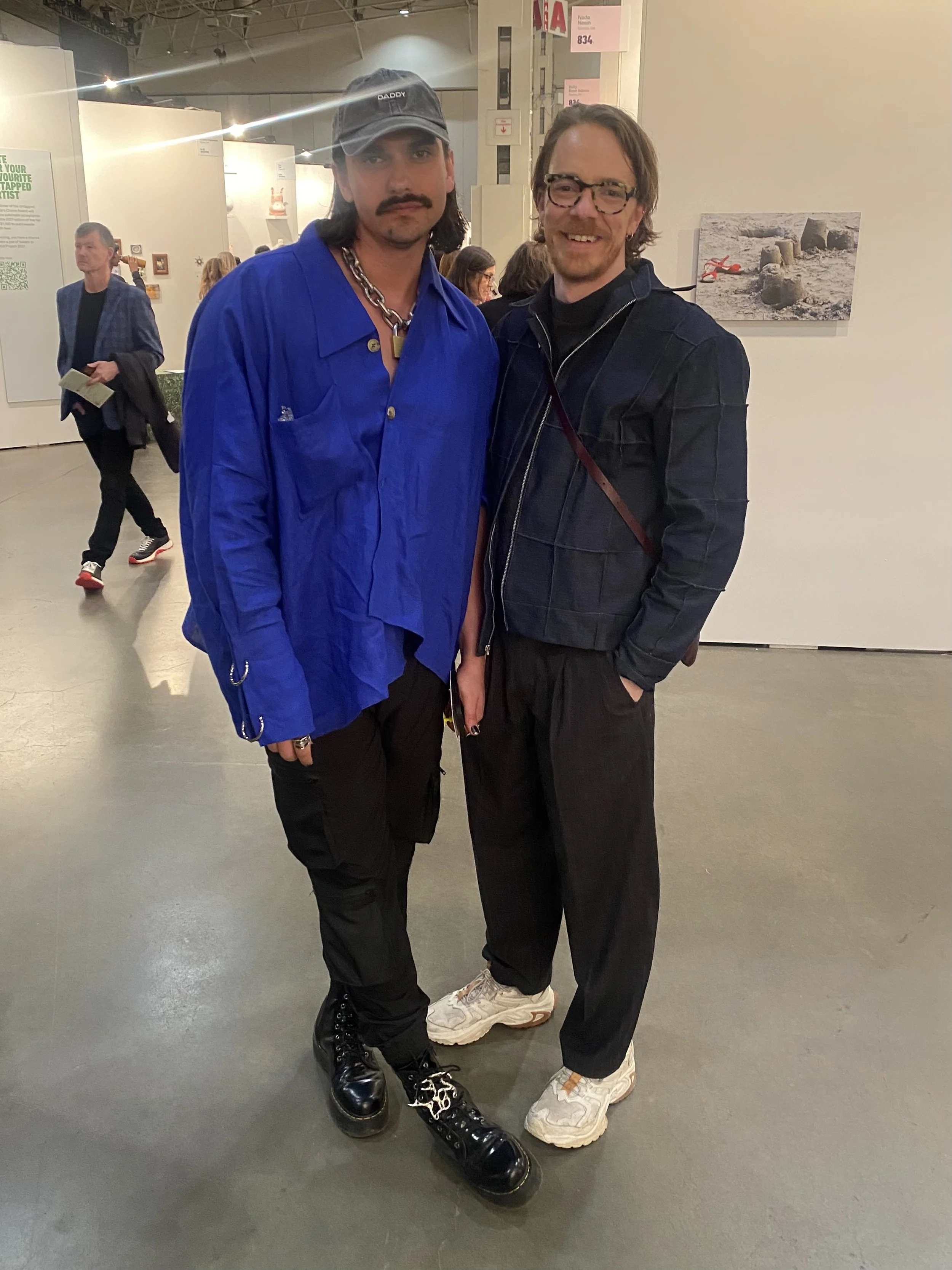 Even a steady spring rainfall couldn’t stop Toronto’s style set from stepping out in their finest for the opening of Artist Project 2026. This year, the fair was set in the Enercare Centre instead of its previous digs in the Better Living Centre; the expanded footprint offered even more of a runway for artists and revellers alike. I and Opaloma editorial intern, Hana Lang, were dressed as opposites – which prompted my favourite artistic discovery of the evening, paper artist Seden Li, to remark on the oppositional outfit effect.